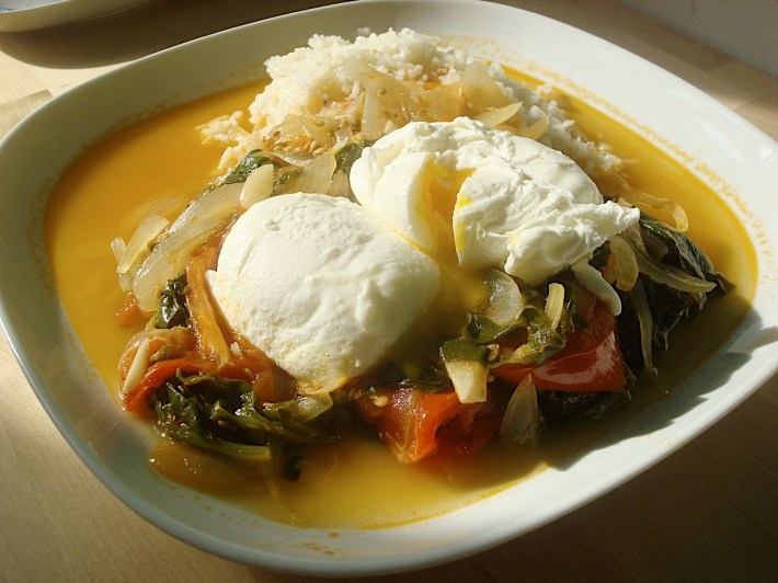 poached eggs on tomato, onion and courgette sauce with rice