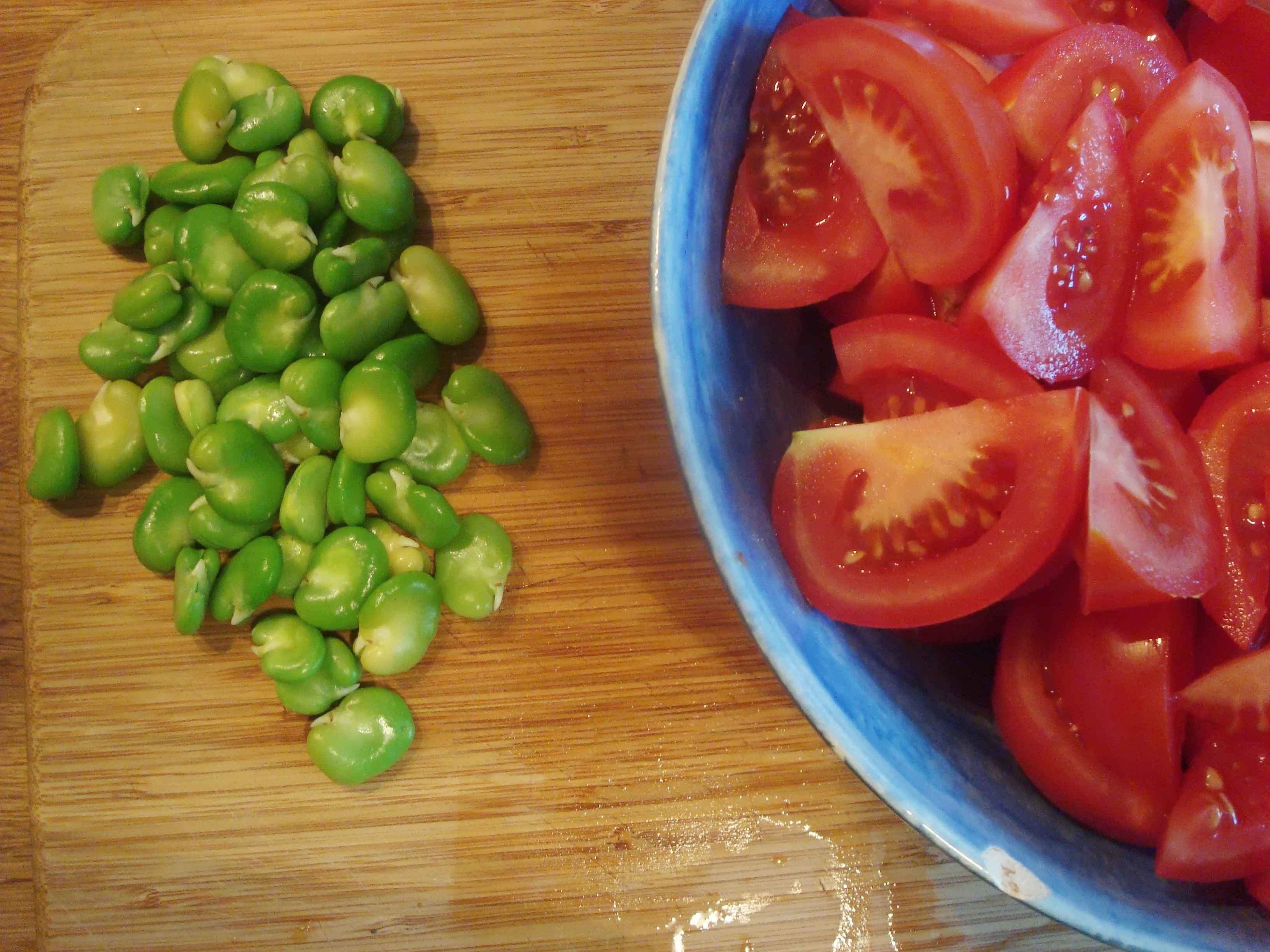 ← Fava Beans: young glistening green dots / Fava Bohnen: glitzernde, frische grüne Punkte