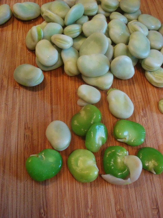 ← Fava Beans: young glistening green dots / Fava Bohnen: glitzernde, frische grüne Punkte