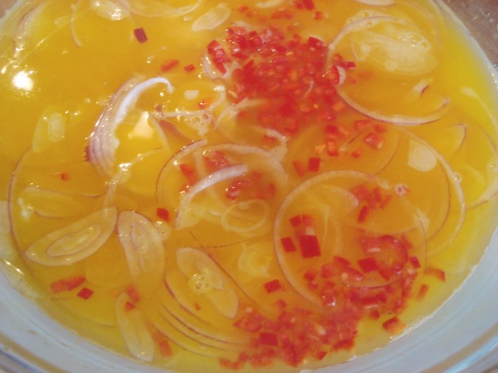 red onion, red chili marinating in the orange juice