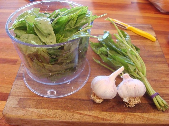 Basil and garlic in the blender cup