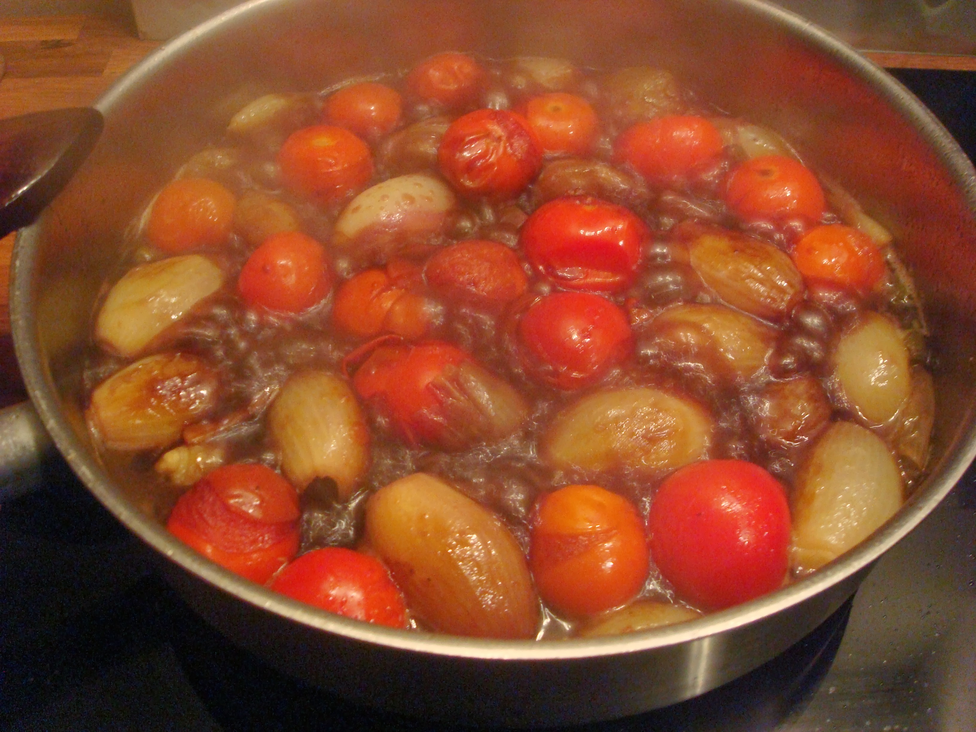 Mustard Rack of Lamb with glazed shallots and tomatoes