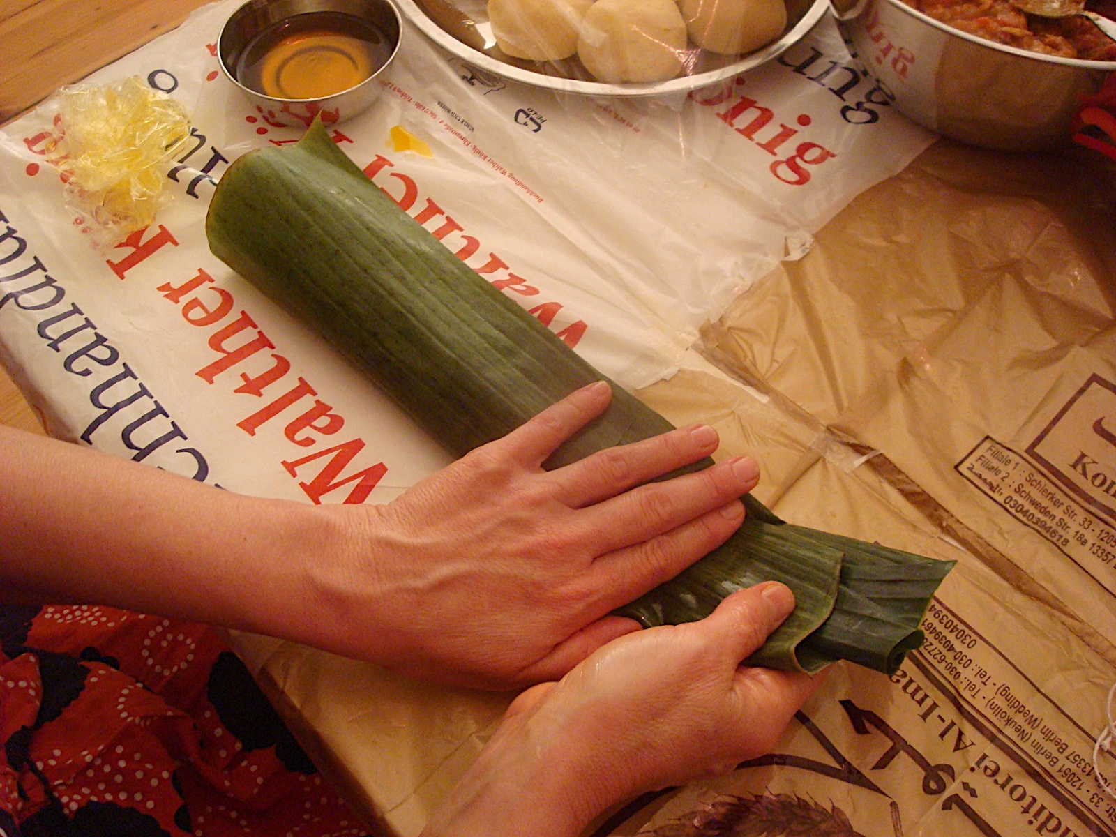 wrapping the banana leaves around the dough and stew