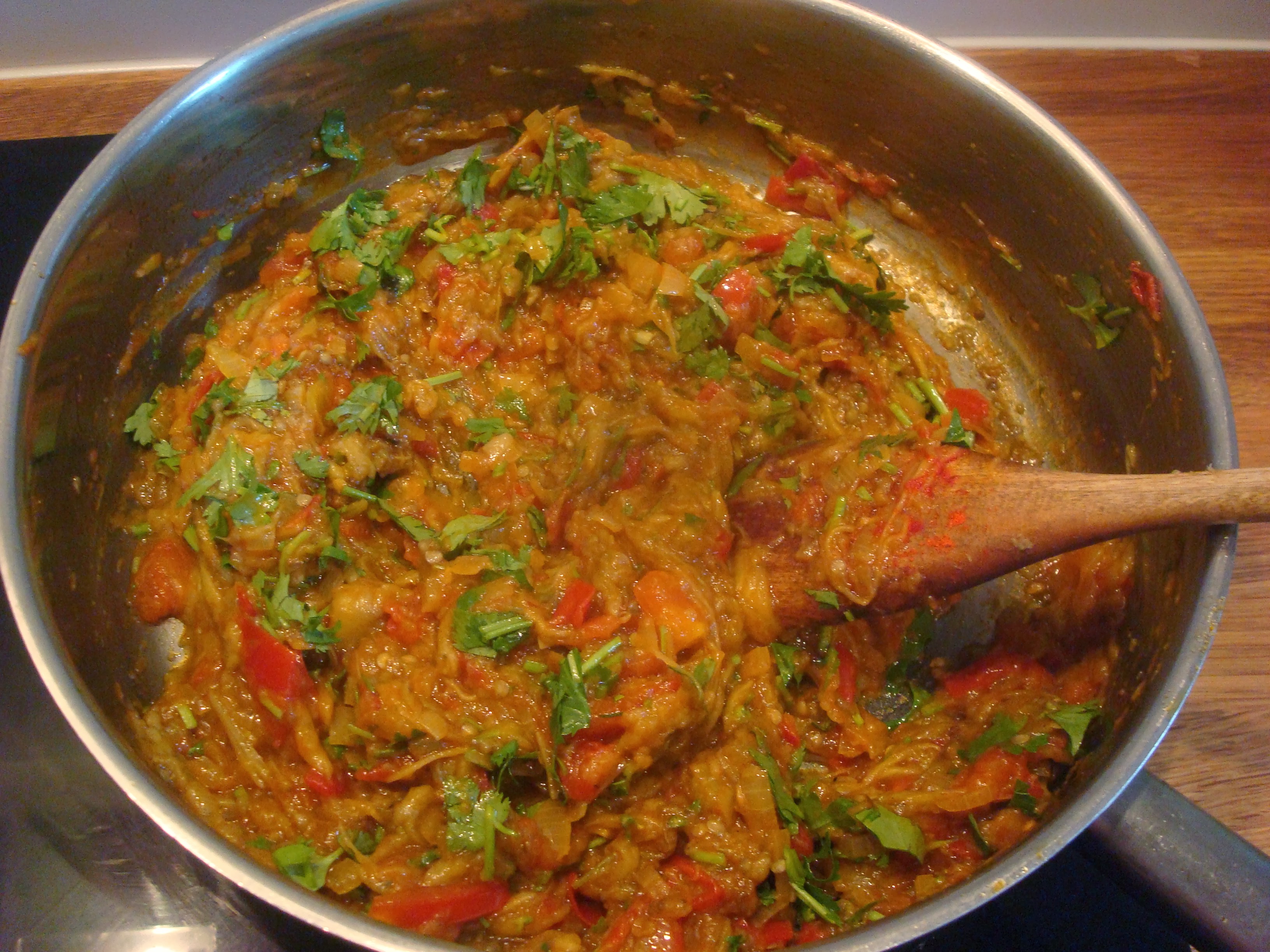 Bharta: smoked aubergine with tomato and herbs