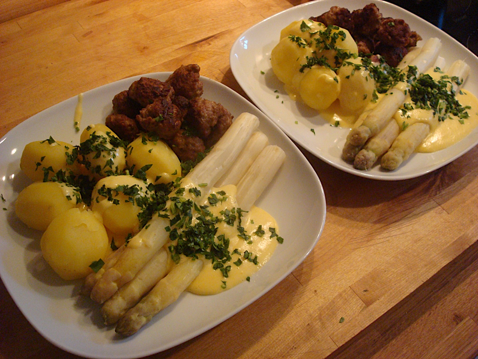 Kartoffeln, Spargel mit Sauce Hollandaise und Fleischklößchen