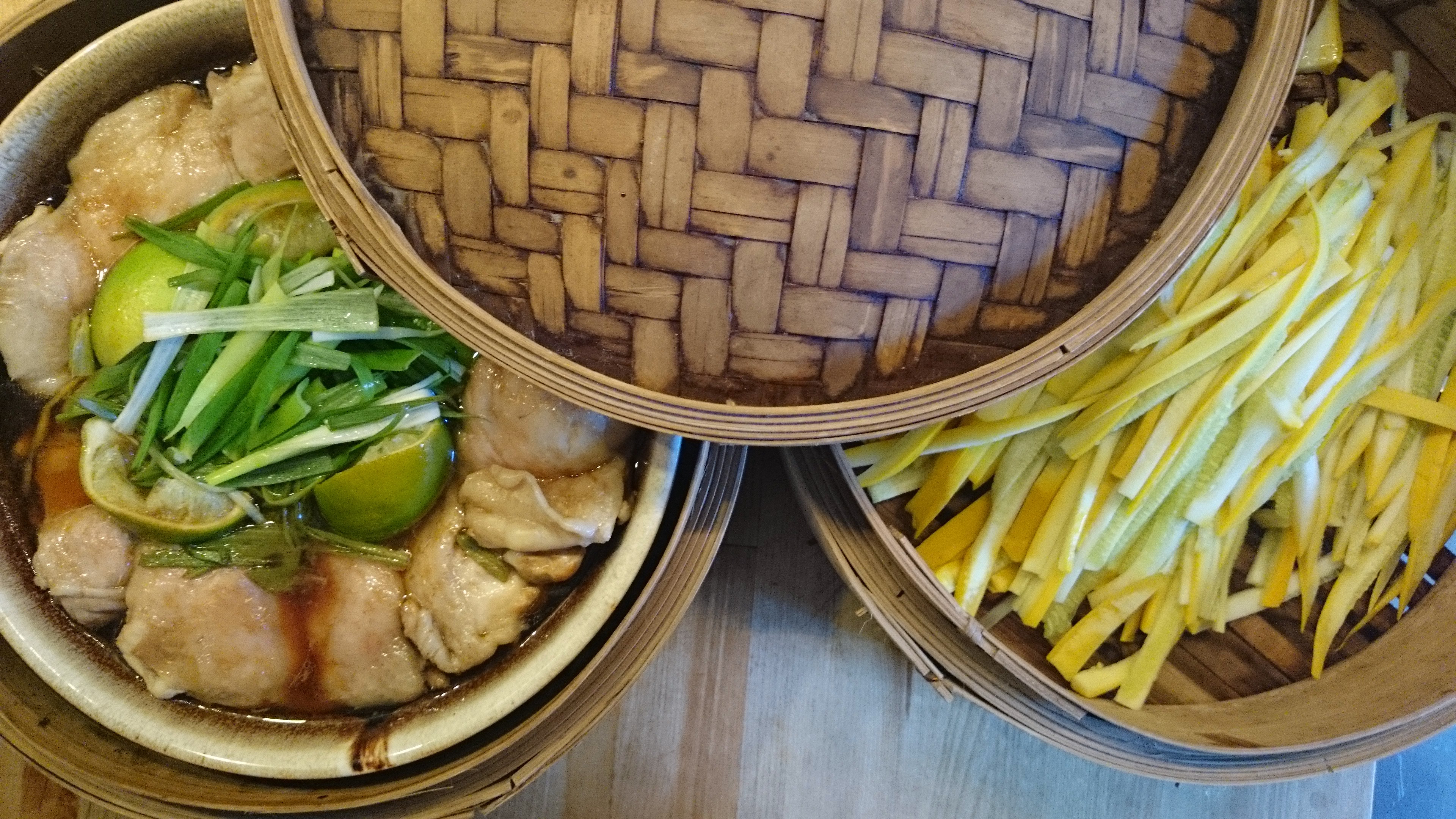 ← One storey, another and perhaps a few more: Steamed Lime Chicken with its Summer Friend the Courgette.