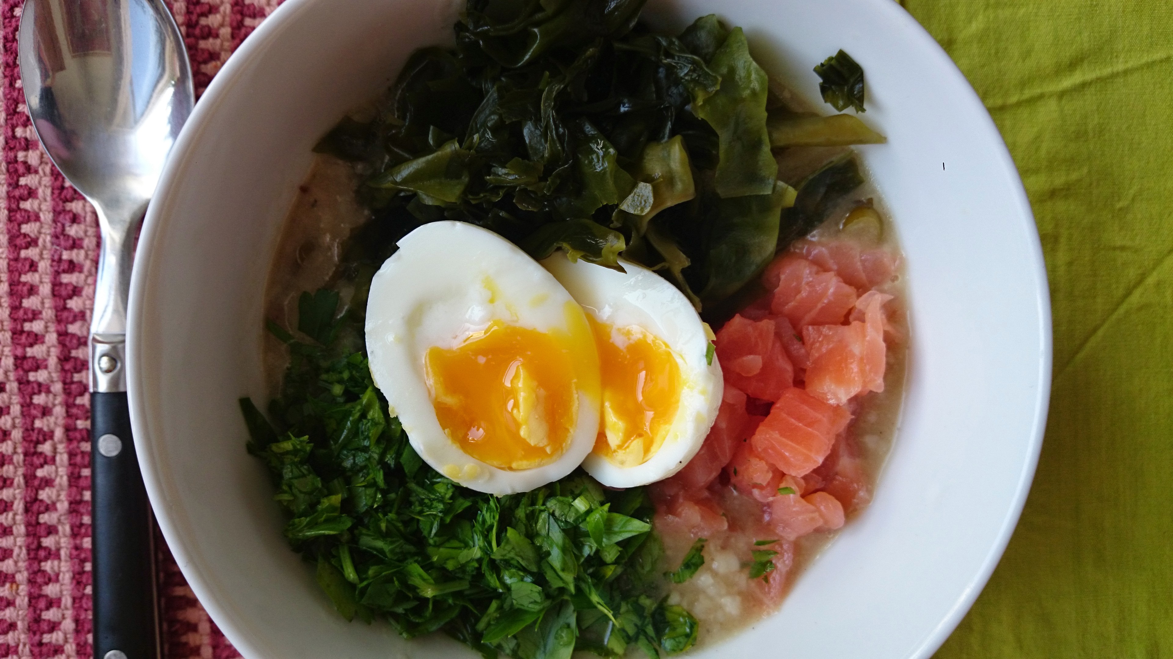Breakfast Congee with kelp, lax, parsley and soft boiled eggs