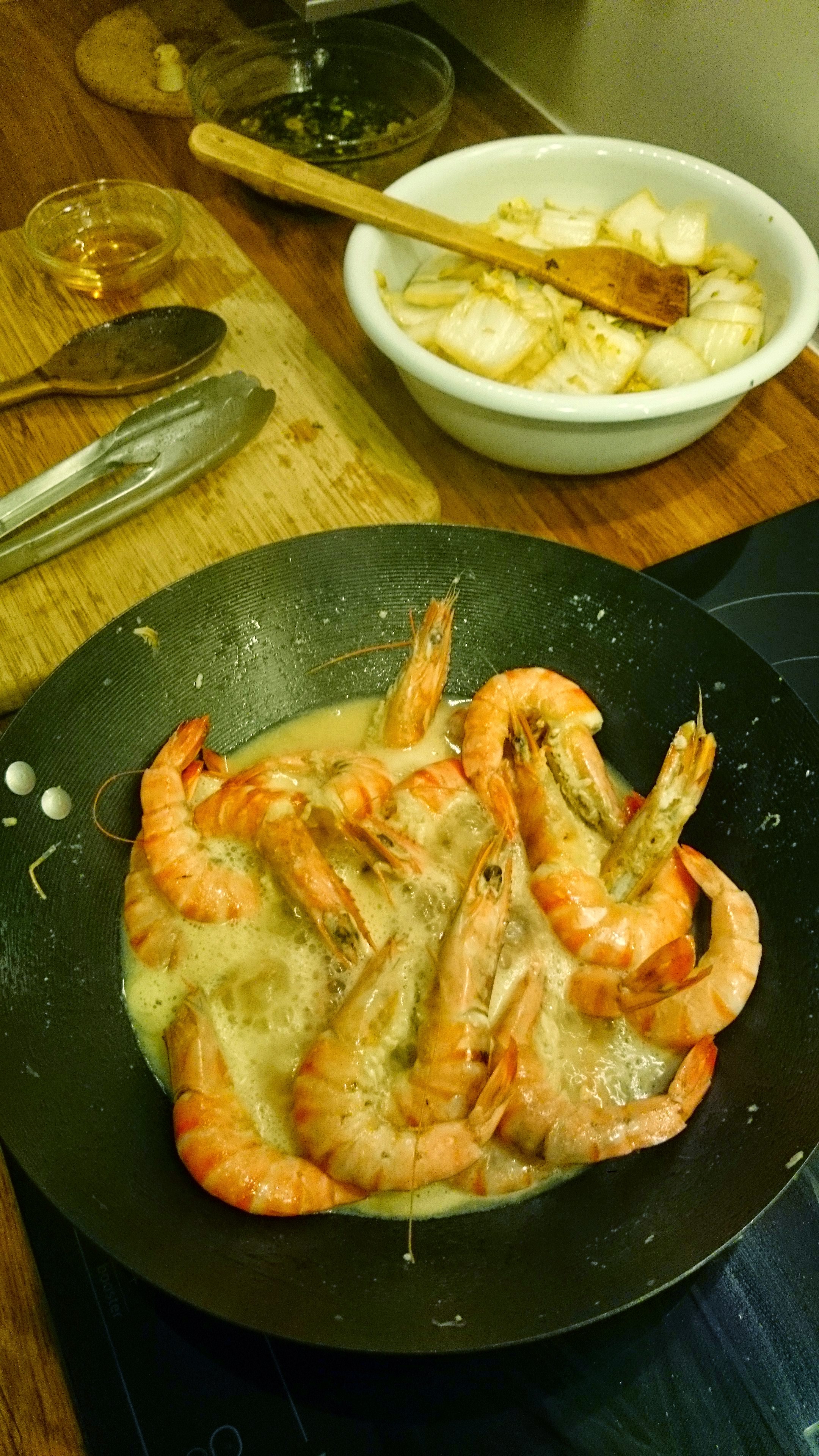Prawn steaming in broth and Shao Xing