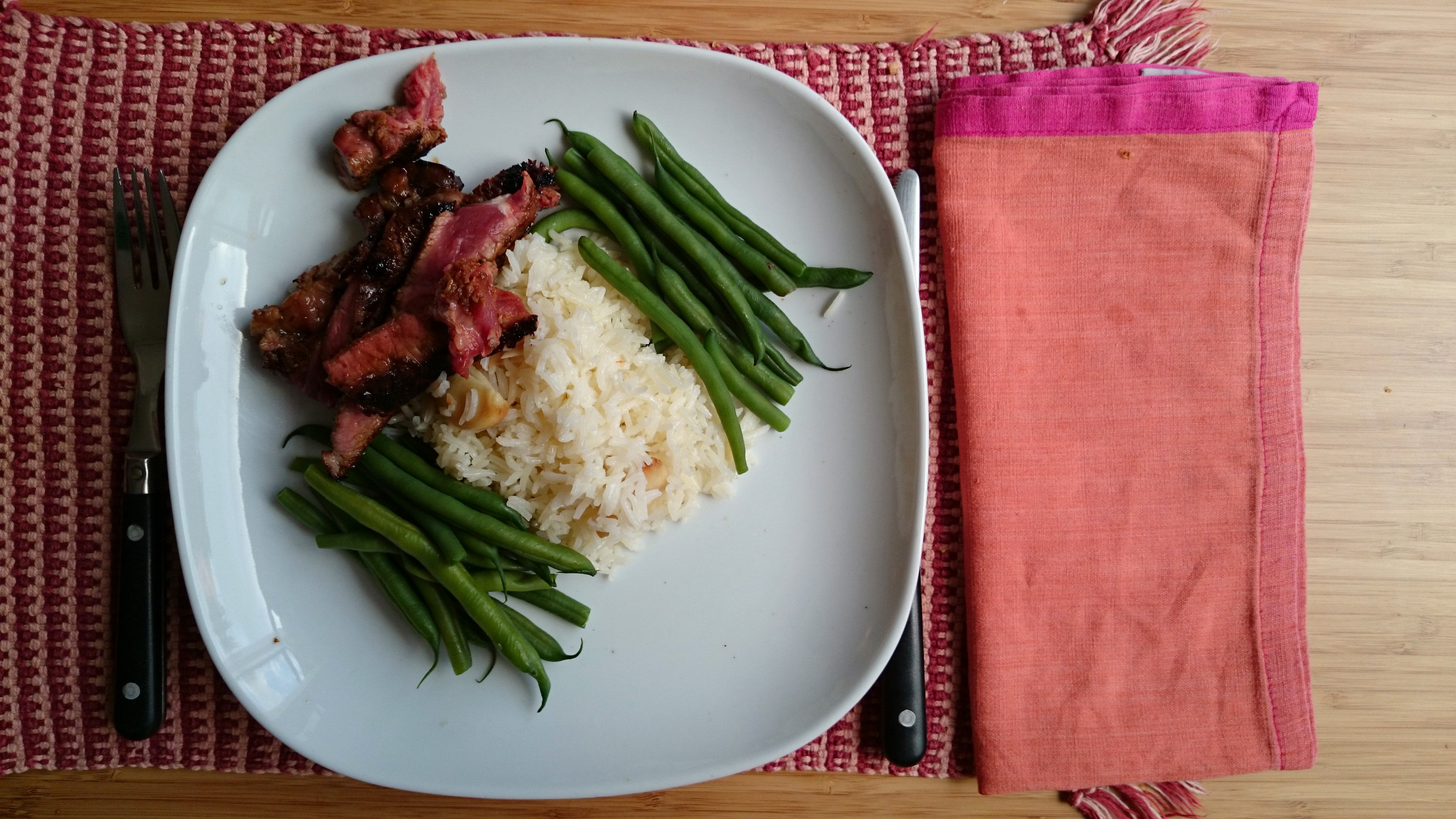 Summer balcony grilled beef with spicy sauce, steamed rice and green beans
