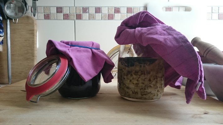red cabbage and white cabbage in preserving jars, weighed down and covered with cotton cloth