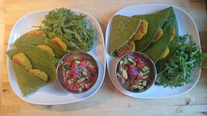 Golden falafel in green spinach fields