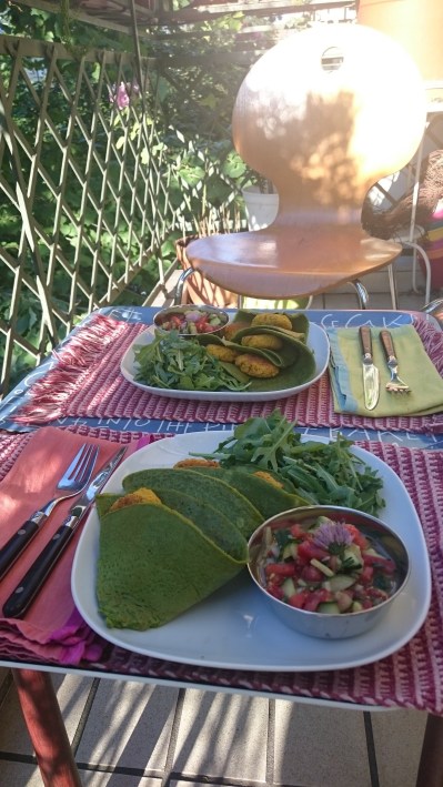 Golden falafel in green spinach fields