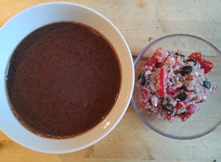 Black bean soup and blugur, tomato, pumpkin seed and feta salad